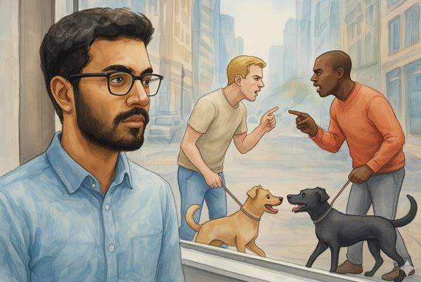 வெள்ளைக்காரன் என்ன கூறினான் என்பது தெரியவில்லை. ஆனால் அவனது வாய் அசைப்பிலிருந்தும், அவன் முகத்தில் வெடித்துக் கொண்டிருந்த ஒருவித அசூயை கலந்த சினத்திலிருந்தும் அவன் தன் தவறினை உணர்ந்ததாகத் தெரியவில்லை என்று பட்டது. கறுப்பு மனிதனின் ஆத்திரமும் அதிகரித்து விட்டது. இவனிலும் தவறிருந்தது. மோதலைத் தவிர்ப்பதற்கு இவனுக்கும் ஒரு சந்தர்ப்பமிருந்தது. ஆனால் இவனும் அதனை உணர்ந்ததாகத் தெரியவில்லை. பதிலிற்கு இவனும் பலமாகத் தலையினை அசைத்துக் கத்துவதைப் பார்க்க முடிந்தது. இவர்கள் இருவரிற்குமிடையில் ஏற்பட்ட மோதல் பாதசாரிகள் பலரது கவனத்தினை இழுத்து விட்டது. இவர்களைச் சுற்றி வேடிக்கை பார்க்கத் தொடங்கினார்கள். 'உப்புச் சப்பில்'லாததொன்றிற்காக இவர்கள் மோதுவதாக யன்னலிற்கப்பாலிருந்து வேடிக்கை பார்த்துக் கொண்டிருந்த என்னால் உணர முடிந்தது. ஒருவேளை யன்னலிற்கப்பால் இருந்திருந்தால் நானும் அவர்களைப் போல்தான் மோதியிருப்பேனோ? யன்னலிற்கிப்பாலிருப்பதால் தான் இவ்விதம் எண்ணுகின்றேனோ? இங்கிருந்து பார்க்கும் போது ஏன் தான் அங்கு இவ்விதம் அடிபட்டுச் சாகின்றார்களோ என்று படுவதில்லையா? மிகவும் இலகுவான தீர்விற்கான வழிகள் இருக்கும் போது அவர்கள் ஏன் தான் இவ்விதம் மோதுகின்றார்களோவென்று படுவதில்லையா? அதுபோல் தான் இதுவுமோ?