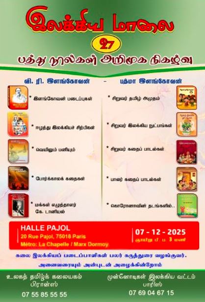 பாரிஸ் மாநகரில் நடைபெறவுள்ள இலக்கிய மாலையில் பத்து நூல்களின் அறிமுக நிகழ்வு இடம்பெறவுள்ளது. பாரிஸ் மாநகரில் வாழும் மூத்த எழுத்தாளர்களான வி. ரி. இளங்கோவன் - பத்மா இளங்கோவன் ஆகியோரின் பத்து நூல்கள் அறிமுக நிகழ்வு - இலக்கிய மாலை 07 - 12 - 2025 ஞாயிற்றுக்கிழமை பிற்பகல் 3 மணிக்கு பாரிஸ் - லாச்சப்பலுக்கு அருகிலுள்ள 'பஜோல்" மண்டபத்தில் நடைபெறவுள்ளது.