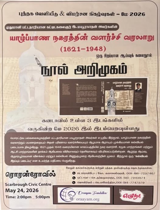 யாழ்ப்பாண நகரத்தின் வளர்ச்சி வரலாறு (1621 - 1948)' நூல் வெளியீட்டு நிகழ்ச்சி மே 24 அன்று 'டொரோண்டோ'வில் நடைபெறவுள்ளது. அது பற்றிய