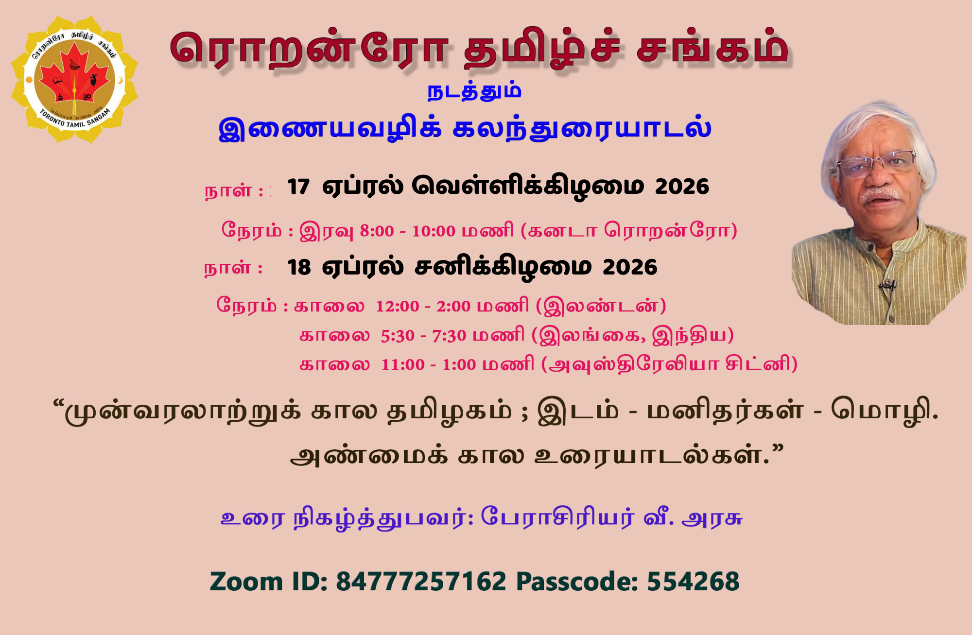 ரொறன்ரோ தமிழ்ச் சங்கம் நடத்தும் இணையவழிக் கலந்துரையாடல்: "முன்வரலாற்றுக் கால தமிழகம் ; இடம் - மனிதர்கள் - மொழி. அண்மைக் கால உரையாடல்கள்."