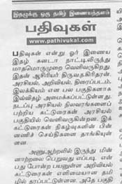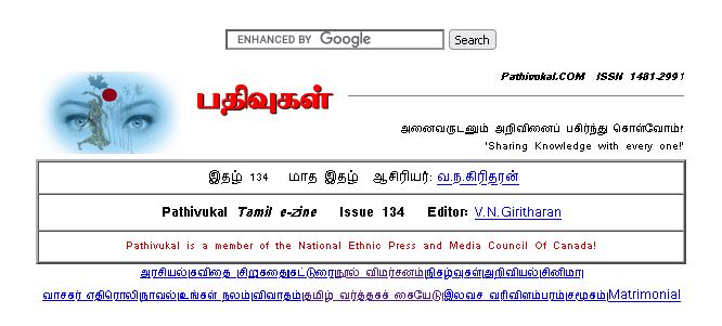 While there are more than a dozen websites in Thamil promoting literary and cultural events of the Thamilians in Thamilnadu in India, it is Giritharan's 'Pathivukal' e-zine that gives almost exclusively a comprehensive coverage of the Lankan Thamil literary scene, apart from other subjects like politics. But the accent in 'Pathivukal' is on contemporary Thamil literature including what is produced in India. courtesy: Daily News (Sri Lanka)