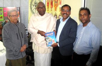 | - புகைப்படத்தில்: கலாநிதி நா. சுப்பிரமணியன், வைத்திய கலாநிதி லம்போதரன், விசேட பிரதியைப் பெற்றுக் கொண்ட எழுத்தாளர் குரு அரவிந்தன், மற்றும் எழுத்தாளர் அகில் - |