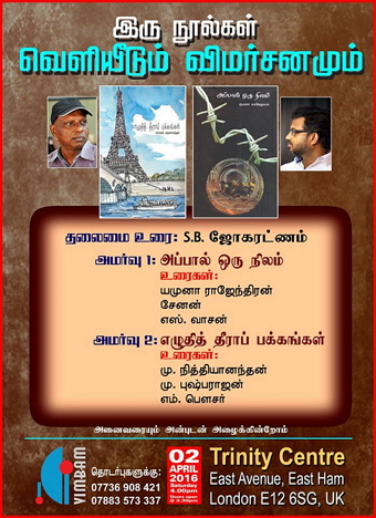 செல்வம் அருளானந்தத்தின் *எழுதித் தீராப் பக்கங்கள் * நூலும் , குணா கவியழகன் எழுதிய * அப்பால் ஒரு நிலம்* நூலும் இந்நிகழ்வில் இடம்பெறவுள்ளன. நடைபெறும் இடம்: Trinity Centre , East Avenue, Eastham, London, E12 6SG காலம் :0 2 ஏப்ரில் 2016, சனிக்கிழமை மாலை 4.00 மணிக்கு தொடர்புகளுக்கு:. 07736 908 421(K.K. RAJA)