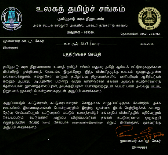 தகவல்: உலகத் தமிழ்ச் சங்கம் மதுரை - மின்னிதழ் செய்தி!