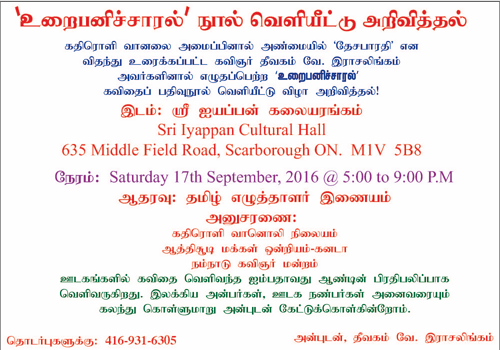 நேரம்: Saturday 17th September, 2016 @ 5:00 to 9:00 P.M