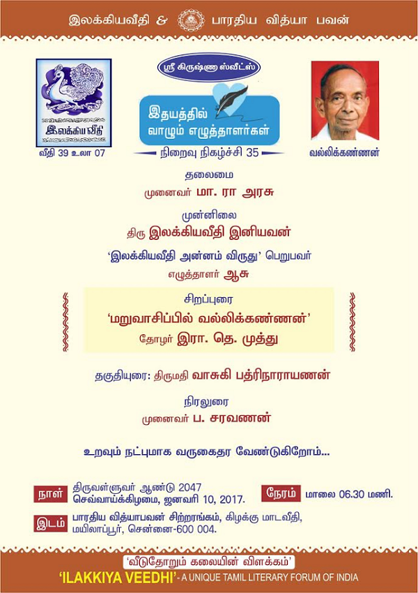 வரிசையில் இந்த மாதம் - 10.01.2017 - செவ்வாய் அன்று மாலை 06.30 மணிக்கு -