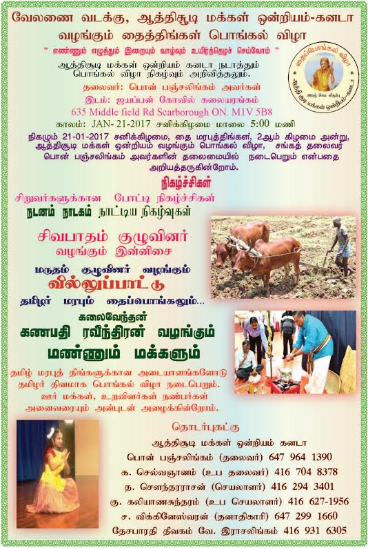 தமிழ்மரபு போற்றும் ஒரு தனித்துவப் பொங்கல்விழா! சிந்தனையில் ஆழ்த்தும் பாரதியாரின் பூமிக்கு வருகை! கலைவேந்தன் கணபதி-தேசபாரதி சந்திக்கும் ஒரு கவிதாநிகழ்ச்சி! சிறுவர் பெரியோர் நிகழ்வுகளோடு மகிழ்விக்கும் விழா! அனைவரும் வருக!