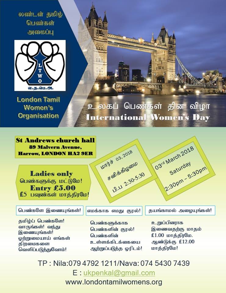 உலகப் பெண்கள் தினவிழா!இலண்டன் தமிழ் பெண்கள் அமைப்பு வரும் சனிக்கிழமையன்று மார்ச் 3ஆம் திகதியன்று பிற்பகல் 230 தொடக்கம் 530 மணி வரை கலை நிகழ்ச்சிகளுடன் கூடிய கருத்து ரீதியான நிகழ் வுகளையடக்கிய விழாவை நடாத்தும் பணியில் ஈடுபட்டுள்ளது. பெண்களுக்கென பெண்களால் நடாத்தும் விழா இது என்பதும் குறிப்பிடத் தக்கது.