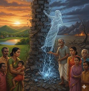 இப்பதிவுக்கேற்ற ஓவியமொன்றினை வரைந்து தருவதுடன் அதற்கான விளக்கத்தையும் கூறும்படியும் செயற்கை நுணணறிவான கூகுள் நனோ பனானாவிடம் கேட்டபோது அது வரைந்த ஓவியமதான் இங்குள்ள ஓவியம்,. அதற்கான விளக்கத்தைக் கீழே தந்துள்ளேன்.