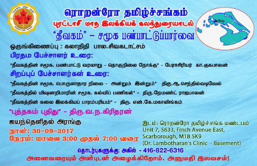 அன்புடையீர், வணக்கம்! எழுத்தாளர் கி. ரா.வின் 95-ஆவ்து பிறந்த நாள் விழா 16 செப்டெம்பர் 2017, சனிக்கிழமை அன்று காலை 9 முதல் இரவு 9 வரை புதுச்சேரி பொறியியல் கல்லூரி எதிரில் உள்ள பல்கலைக்கழக அரங்கில் நடைபெறவுள்ளது. அழைப்பிதழ் இணைத்துள்ளோம்.அனைவரும் வருகை தருமாறு கேட்டுகொள்கிறோம்.