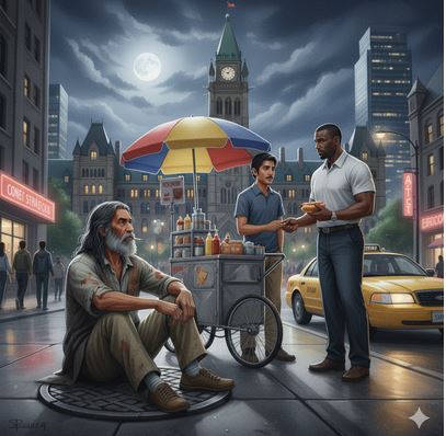 ஜெயகாந்தனின் ரிஷிமூலத்தில் வரும் ராஜாராமனைப் போல்தாடி மீசை வளர்த்திருந்தான். கால்களில் ஒன்றினைச் சப்பணமிட்ட நிலையிலும் மற்றதை உயர்த்தி மடக்கி முழங்காலினை வலது கையினால் பற்றியிருந்தான். இடதுகையை பின்புறமாக நிலத்தில் ஊன்றியிருந்தான். முடிநீண்டு வளர்ந்து கிடந்தது, வாயினில் பாதித்துண்டு சிகரட் புகைந்த படியிருந்தது. கண்களில் மட்டும் ஒரு விதமான ஒளி வீச்சு விரவிக் கிடந்தது. மான் தோலில் அமர்ந்திருக்கும் சாமியாரைப் போல மான் ஹோலின் மேல் அமர்ந்திருந்தவனின் தோற்றமிருந்தது. இவன் நடைபாதை நாயகர்களிலொருவனென்றால் நான் ஒரு நடைபாதை வியாபாரி. "கொட் டோக்" (Hot Dog) விற்பது என் தொழில். வடக்கில்'தொலைவில் ஒண்டாரியோ பாராளுமன்றக் கட்டடம் தெரிந்தது. எமக்குப் பின்புறமாக புகழ்பெற்ற குழந்தைகளிற்கான வைத்தியநிலையம், 'சிக்கிட்ஸ்'ஹாஸ்பிடல் அமைந்து கிடந்தது சிறிது நேரம் சாமியார் ஒண்டாரியோ பாராளுமன்றத்தையே பார்த்தபடியிருந்தான். பிறகு சிரித்தான். 'ஏன் சிரிக்கிறாய்' என்றேன்.